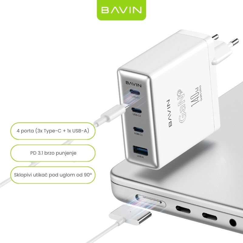 BAVIN 140W adapter je oko 25% manji u odnosu na klasični 140W punjač, a po veličini je približan standardnom 61W adapteru.