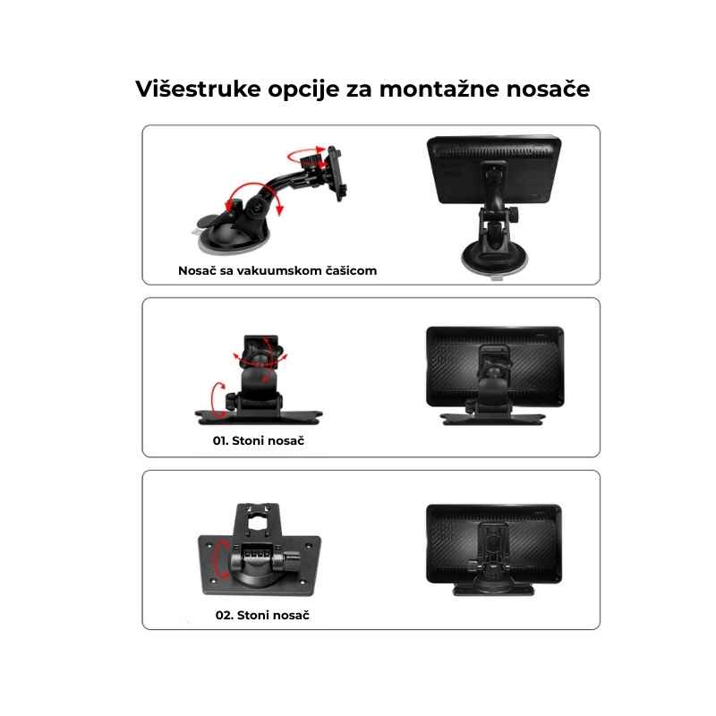 - Višestruke opcije montaže: vakuumski nosač i dva stona nosača uključeni u paketu.