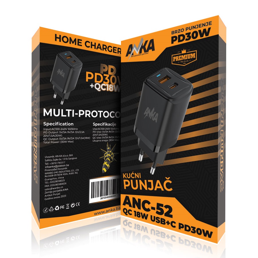 PUNJAC KUCNI ANC-52 USB+C PD 30W 2 PORT ANKA