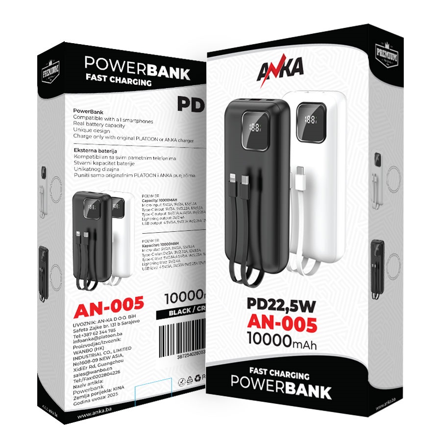 POWERBANK AN-005 10000MAH PD22,5W KABAL 2U1 ANKA CRNI